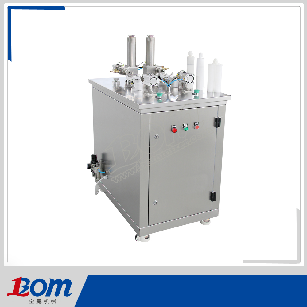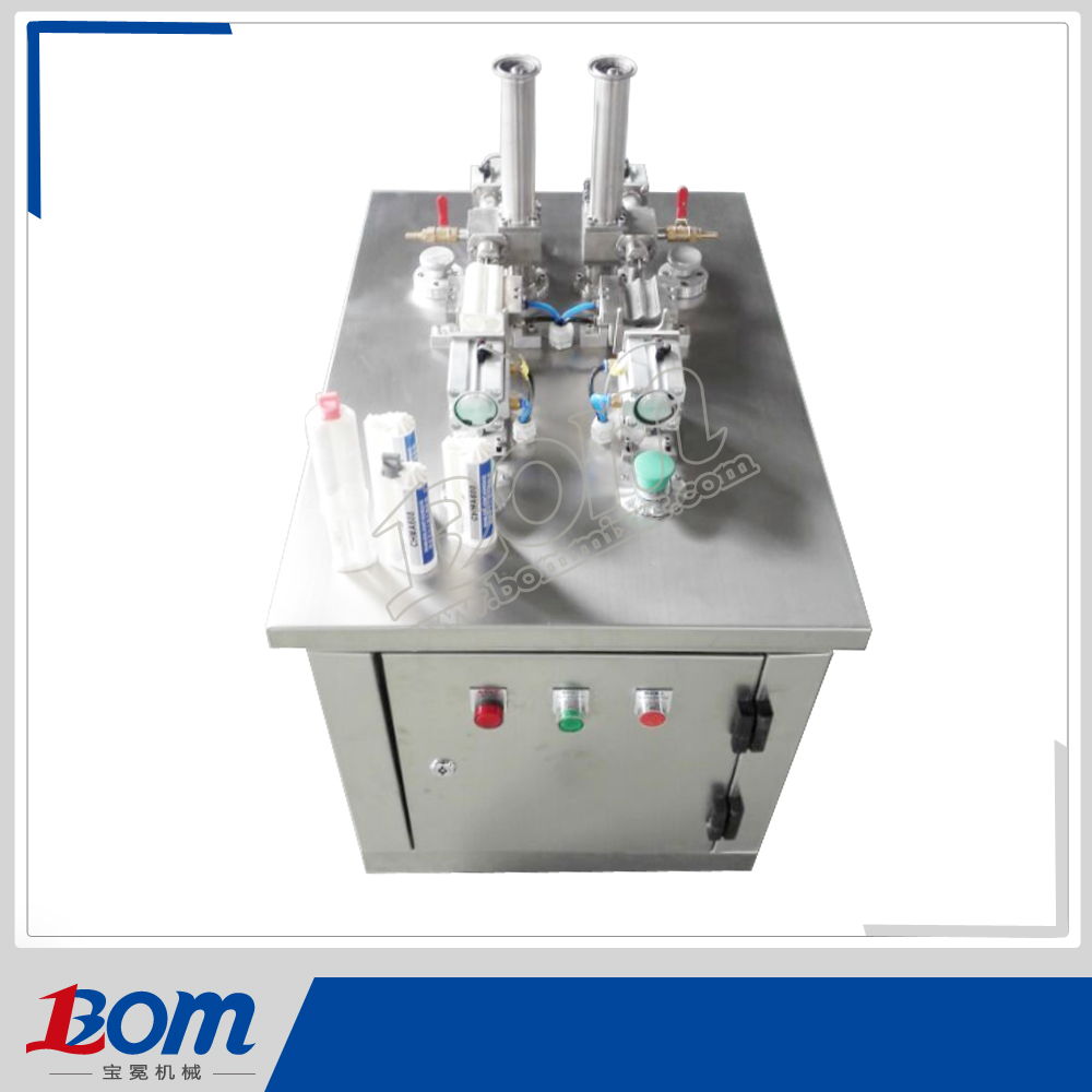 1.该机为半自动容积式灌装机,配有压后盖装置; 2.AB组份分两次从出胶口灌装,灌装量可任意调节。 3.操作简单,灌装精度高,胶管口无冒胶,不会在灌装过程中产生二次气泡; 4.气动部分均采用台湾AirTac的气动元件,保证机器运行性能。 5.物料接触部分均采用SU304不锈钢材质制成。